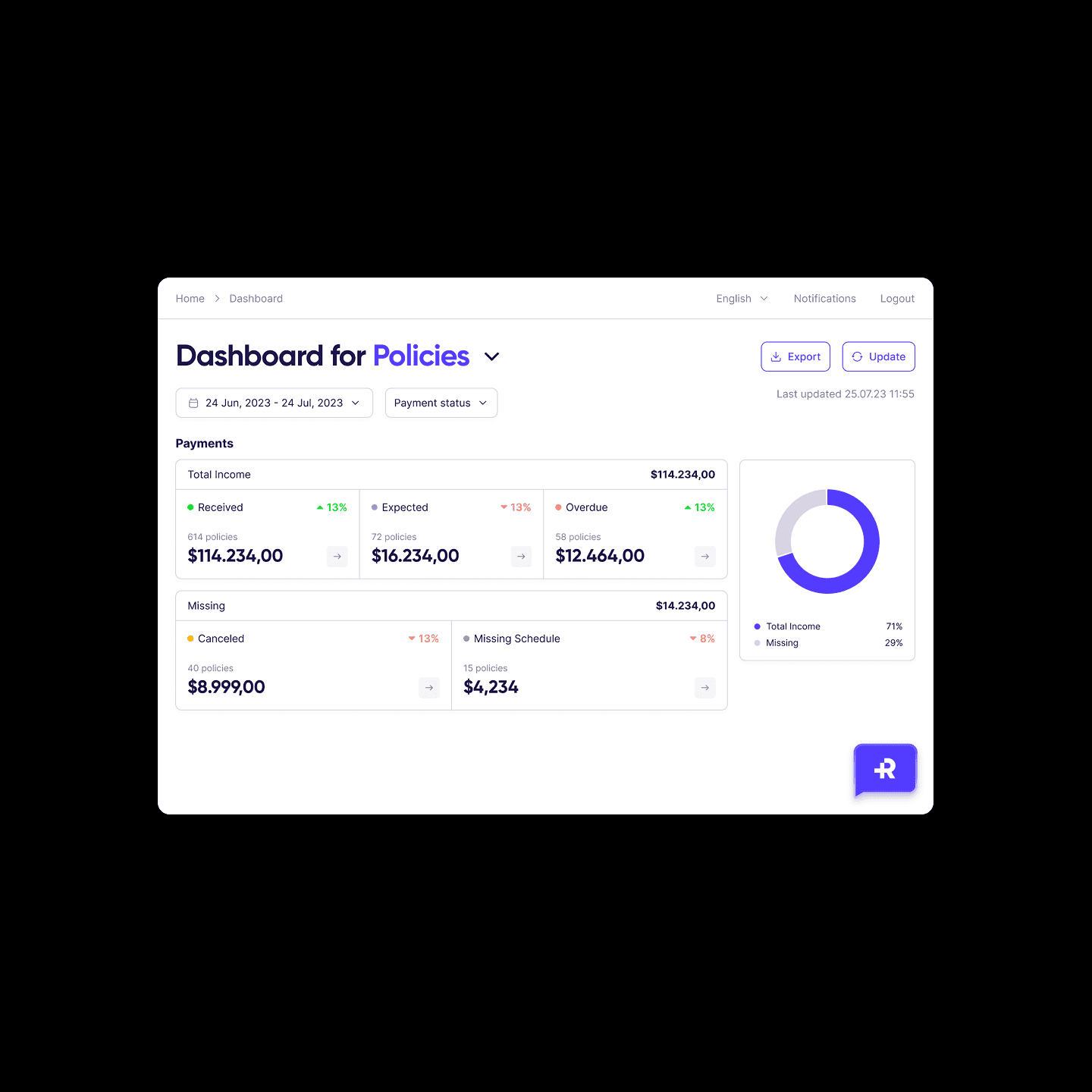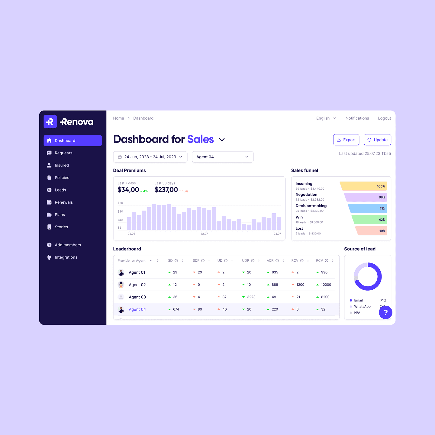 The B2B insurance company operated with fragmented data across sales, policies, and payments. Agents lacked clear visibility into performance, while management had limited control over revenue and cash flow. This slowed decision-making and reduced funnel efficiency.